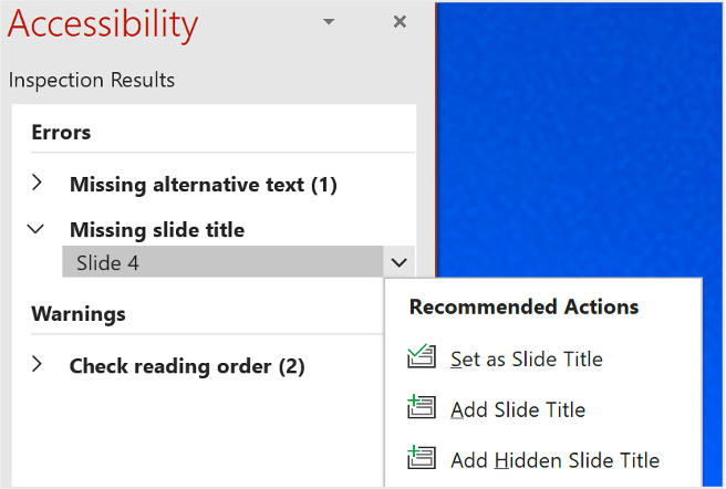 Every slide needs a unique title for accessibility purposes. But what if you don’t want a title to show up on the slide? If you’re a Windows user, you can choose “Add Hidden Slide Title.” This option adds a title off the viewable slide that will be accessible to screen readers. This is useful if your slide consists of only an image, for example.